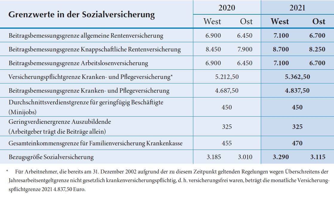 Die Bundesregierung hat beschlossen, die Beitragsbemessungsgrenzen in der Sozialversicherung zum 1. Januar 2021 anzupassen. Die Beitragsbemessungsgrenzen geben an, bis zu welchem Betrag Arbeitsentgelte sozialversicherungspflichtig sind. Übersteigt der Bruttolohn die Bemessungsgrenze, werden die Beiträge zur Sozialversicherung nur bis zur Höhe des jeweiligen Grenzwertes erhoben, und der übersteigende Teil ist sozialversicherungsfrei.