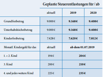 Beschlossen ist die Anhebung des steuerlichen Grundfreibetrages. Liegt das zu versteuernde Einkommen unterhalb des Grundfreibetrages, entsteht keine Einkommensteuer. Für 2018 beträgt der Grundfreibetrag 9.000 Euro und soll für 2019 auf 9.168 Euro und für 2020 auf 9.408 Euro angehoben werden. Bei Zusammenveranlagung verdoppeln sich die genannten Beträge. Eine entsprechende Anpassung ist für den Unterhaltshöchstbetrag vorgesehen, bis zu dem Unterhaltszahlungen an Personen, für die kein Anspruch auf Kindergeld besteht, als außergewöhnliche Belastungen abzugsfähig sind.